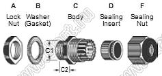 Материал: детали A, C, F - полиамид, цинк или латунь, деталь E - полиамид, детали B и D - EPDM резина