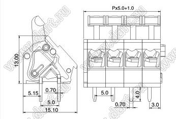 Клеммники нажимные, прямые, с входами проводов под углом 45 град, шаг 5,0 мм