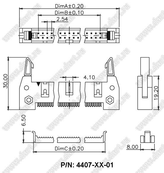Вилки с защелками без монтажных "ушей" на плоский кабель (шлейф) с шагом 1,27 мм серии 4407-XX-01 (IDCC-XXA, DS1012-xxN) предназначены для неразъемного соединения шлейфа с ответной частью данного разъема внутри электронной аппаратуры. Вилки с защелками без монтажных "ушей" на плоский кабель (шлейф) с шагом 1,27 мм серии 4407-XX-01 (IDCC-XXA, DS1012-xxN) поставляются со склада в Москве и под заказ с фабрики.