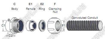 Материал: Цинковый сплав для деталей C, F, Полипропилен для детали E2, Гальванизированный металл для части E1 |