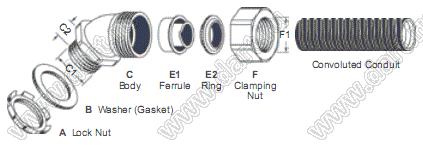 Материал: Цинковый сплав для деталей A, C, F, Полипропилен для деталей B, E2, Гальванизированный металл для части E1
