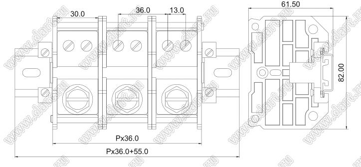 Клеммники на DIN рейку, двухрядные с винтовыми зажимами, с крышкой, шаг 36.0 мм