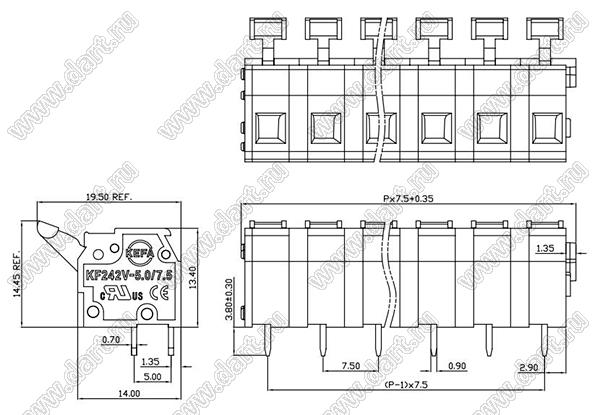 Клеммники нажимные KF242V-7.5 серии с шагом 7.5 мм, прямые, предназначены для монтажа в отверстия печатних плат. Конструкция соответствует международным стандартам IEC60998, UL1059, UL486E, CSA C22.2 No.158. Условия поставки клеммников нажимных KF242V-7.5 серии уточняйте у наших менеджеров.