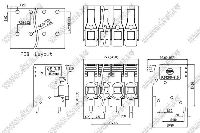 Клеммники нажимные KF206-7.5 серии с шагом 7.5 мм, прямые, предназначены для монтажа в отверстия печатних плат. Конструкция соответствует международным стандартам IEC60998, UL1059, UL486E, CSA C22.2 No.158. Условия поставки клеммников нажимных KF206-7.5 серии уточняйте у наших менеджеров.