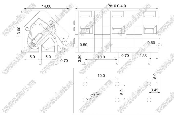 Клеммники нажимные, прямые, с входами проводов под углом 45 град, шаг 10,0 мм