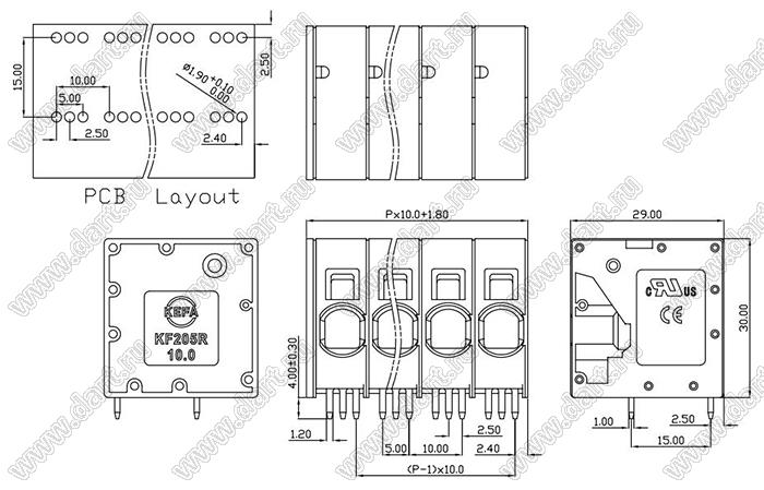 Клеммники нажимные KF205R-10.0 серии с шагом 10.0 мм, угловые, предназначены для монтажа в отверстия печатних плат. Конструкция соответствует международным стандартам IEC60998, UL1059, UL486E, CSA C22.2 No.158. Условия поставки клеммников нажимных KF205R-10.0 серии уточняйте у наших менеджеров.