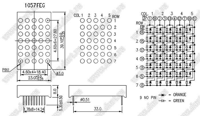 Каталог > Оптоэлектроника и индикация > Индикаторы светодиодные (сегментные дисплеи, матрицы, шкалы, светящиеся поля) > Точечные cветодиодные матрицы > 1,2" (5x7) точечная серия > BJ1057FEG