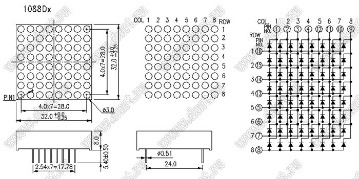 Каталог > Оптоэлектроника и индикация > Индикаторы светодиодные (сегментные дисплеи, матрицы, шкалы, светящиеся поля) > Точечные cветодиодные матрицы > 1,2" (5x7) точечная серия > BJ1088DG