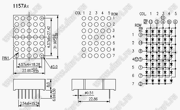 Каталог > Оптоэлектроника и индикация > Индикаторы светодиодные (сегментные дисплеи, матрицы, шкалы, светящиеся поля) > Точечные cветодиодные матрицы > 1,2" (5x7) точечная серия > BJ1157AY