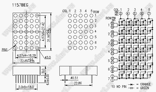 Каталог > Оптоэлектроника и индикация > Индикаторы светодиодные (сегментные дисплеи, матрицы, шкалы, светящиеся поля) > Точечные cветодиодные матрицы > 1,2" (5x7) точечная серия > BJ1157BEG