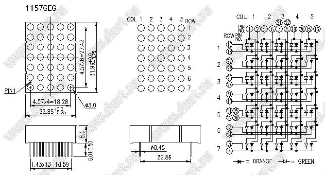 Каталог > Оптоэлектроника и индикация > Индикаторы светодиодные (сегментные дисплеи, матрицы, шкалы, светящиеся поля) > Точечные cветодиодные матрицы > 1,2" (5x7) точечная серия > BJ1157GEG
