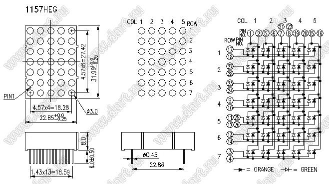 Каталог > Оптоэлектроника и индикация > Индикаторы светодиодные (сегментные дисплеи, матрицы, шкалы, светящиеся поля) > Точечные cветодиодные матрицы > 1,2" (5x7) точечная серия > BJ1157HEG