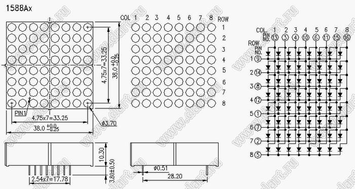 Каталог > Оптоэлектроника и индикация > Индикаторы светодиодные (сегментные дисплеи, матрицы, шкалы, светящиеся поля) > Точечные cветодиодные матрицы > 1,5" (8x8) точечная серия > BJ1588AG
