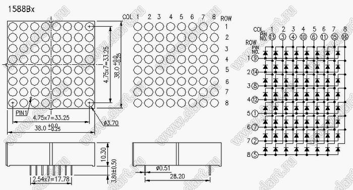 Каталог > Оптоэлектроника и индикация > Индикаторы светодиодные (сегментные дисплеи, матрицы, шкалы, светящиеся поля) > Точечные cветодиодные матрицы > 1,5" (8x8) точечная серия > BJ1588BG