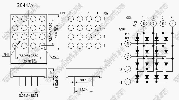 Каталог > Оптоэлектроника и индикация > Индикаторы светодиодные (сегментные дисплеи, матрицы, шкалы, светящиеся поля) > Точечные cветодиодные матрицы > 1,1" (4x4) точечная серия > BJ2044AB