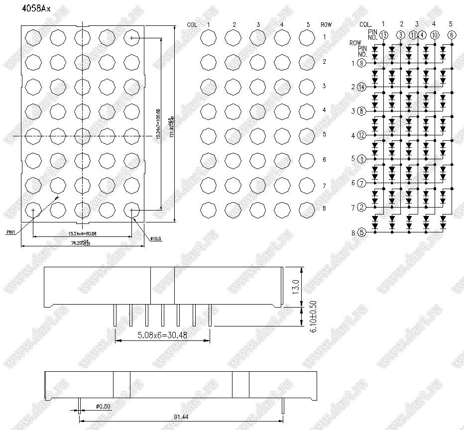 Каталог > Оптоэлектроника и индикация > Индикаторы светодиодные (сегментные дисплеи, матрицы, шкалы, светящиеся поля) > Точечные cветодиодные матрицы > 4,8" (5x8) точечная серия > BJ4058AH
