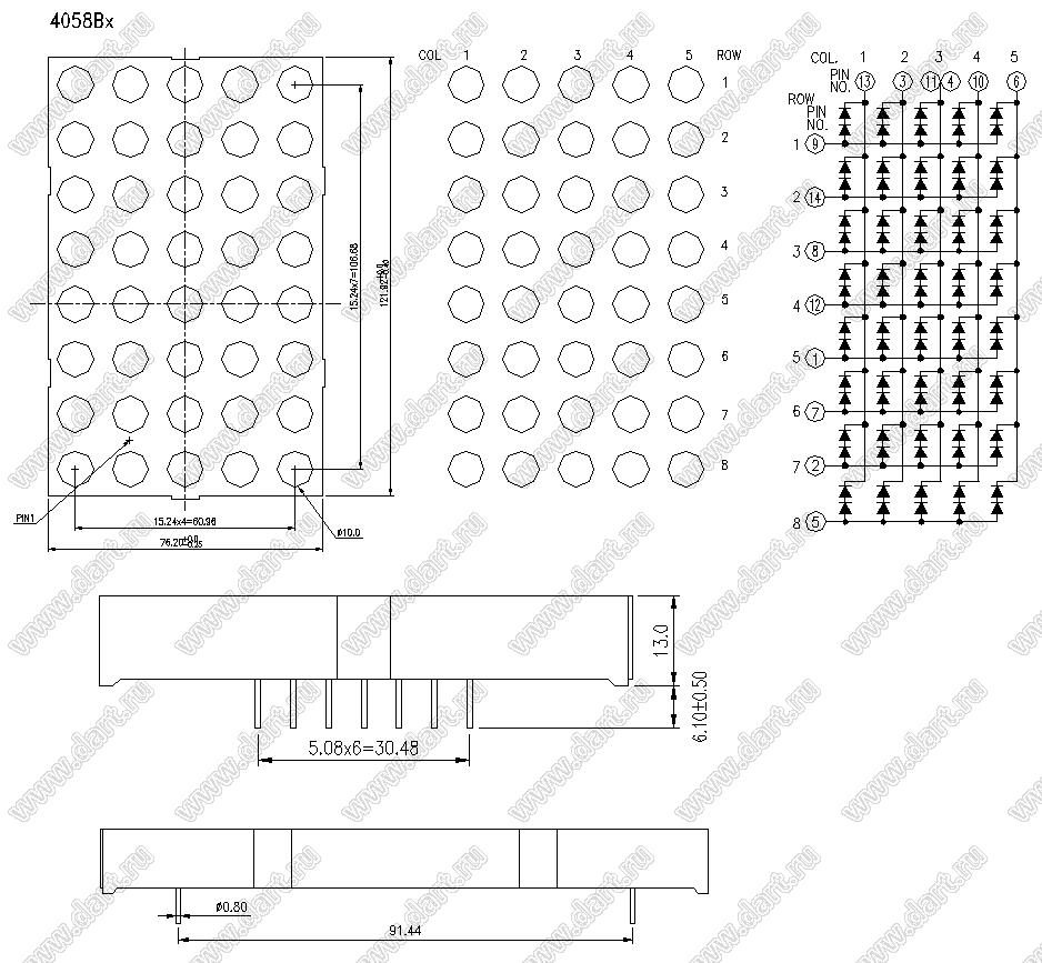 Каталог > Оптоэлектроника и индикация > Индикаторы светодиодные (сегментные дисплеи, матрицы, шкалы, светящиеся поля) > Точечные cветодиодные матрицы > 4,8" (5x8) точечная серия > BJ4058BE