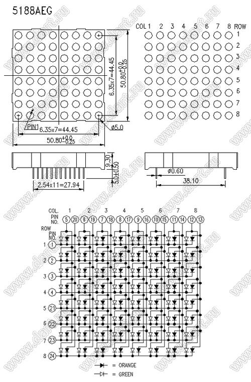 Каталог > Оптоэлектроника и индикация > Индикаторы светодиодные (сегментные дисплеи, матрицы, шкалы, светящиеся поля) > Точечные cветодиодные матрицы > 2,0" (5x7) точечная серия > BJ5188AEG