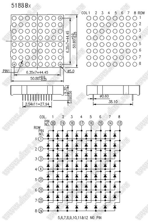 Каталог > Оптоэлектроника и индикация > Индикаторы светодиодные (сегментные дисплеи, матрицы, шкалы, светящиеся поля) > Точечные cветодиодные матрицы > 2,0" (5x7) точечная серия > BJ5188BB