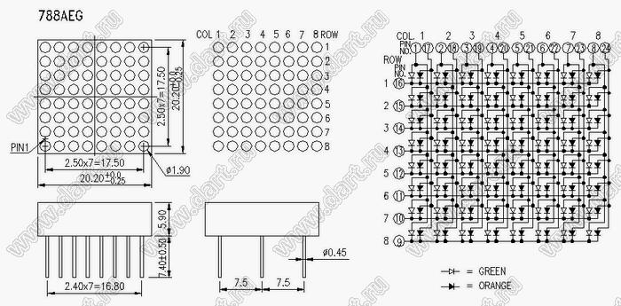 Каталог > Оптоэлектроника и индикация > Индикаторы светодиодные (сегментные дисплеи, матрицы, шкалы, светящиеся поля) > Точечные cветодиодные матрицы > 0,8" (8x8) точечная серия > BJ788AEG