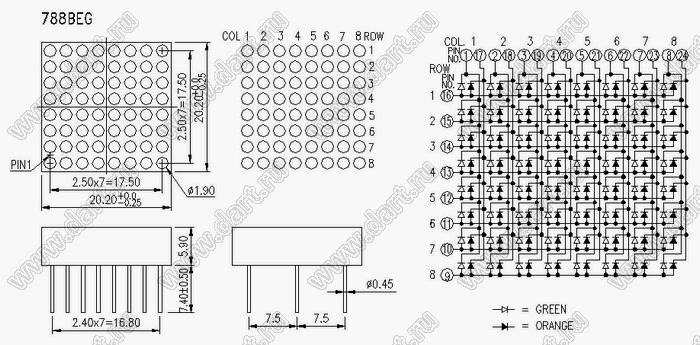 Каталог > Оптоэлектроника и индикация > Индикаторы светодиодные (сегментные дисплеи, матрицы, шкалы, светящиеся поля) > Точечные cветодиодные матрицы > 0,8" (8x8) точечная серия > BJ788BEG