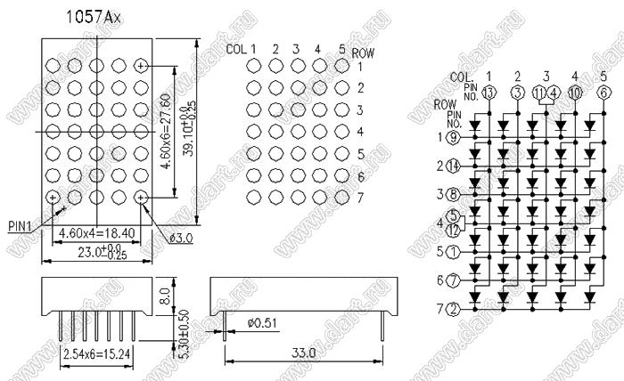 Каталог > Оптоэлектроника и индикация > Индикаторы светодиодные (сегментные дисплеи, матрицы, шкалы, светящиеся поля) > Точечные cветодиодные матрицы > 1,2" (5x7) точечная серия > BJ1057AE