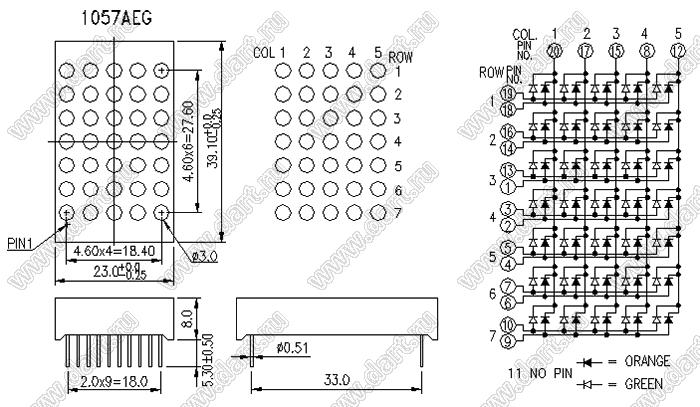 Каталог > Оптоэлектроника и индикация > Индикаторы светодиодные (сегментные дисплеи, матрицы, шкалы, светящиеся поля) > Точечные cветодиодные матрицы > 1,2" (5x7) точечная серия > BJ1057AEG