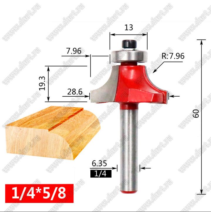 Фреза по дереву для скругления углов; типоразмер 1/4 x 5/8; D=28,88мм; R=7,96мм; B=7,96мм; H=12,00мм