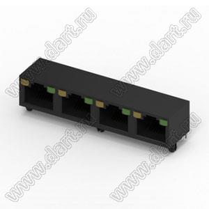 Разъем RJ45, 1х4, угловой, верхняя защелка, DIP, без EMI, со светодиодом