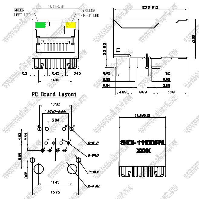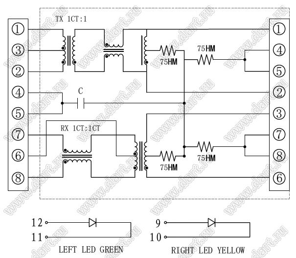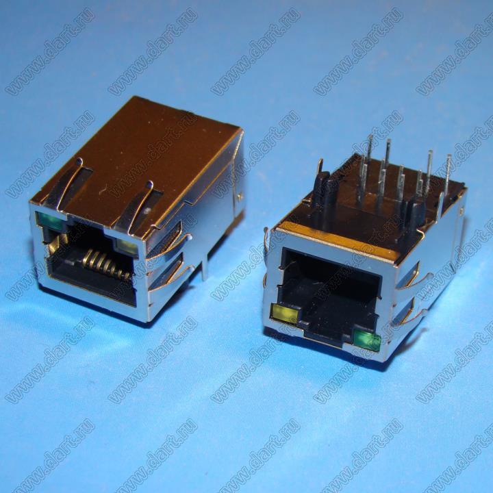 Гнездо RJ-45 8P8C на плату с развязкой, фильтрами и светодиодами