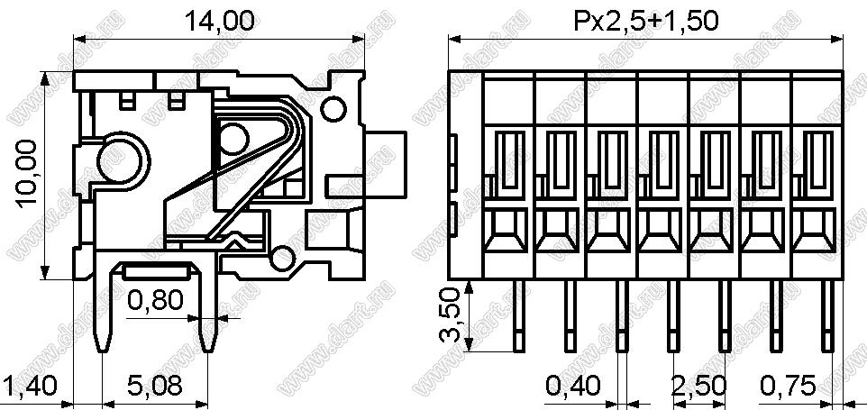 Каталог > Электронные компоненты, радиодетали > Клеммники (колодки клеммные) > Клеммники нажимные безвинтовые для монтажа в отверстия печатных плат > Клеммники нажимные безвинтовые (шаг 2,50 мм) > KF141AR-2.5 серия > KF141AR-2.5-01P-14