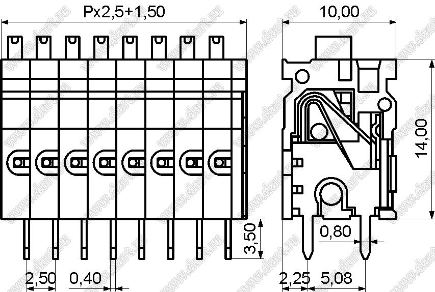 Каталог > Электронные компоненты, радиодетали > Клеммники (колодки клеммные) > Клеммники нажимные безвинтовые для монтажа в отверстия печатных плат > Клеммники нажимные безвинтовые (шаг 2,50 мм) > KF141AV-2.5 серия > KF141AV-2.5-01P-11