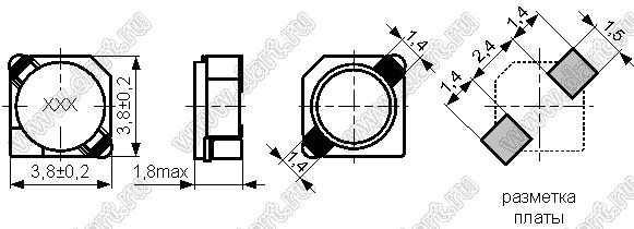 Габаритные размеры: 3,8x3,8x1,8 мм Допуск: 30% Тестовая частота F: 100 кГц Обозначение допуска: N Диапазон температур: -30…+100 °C |