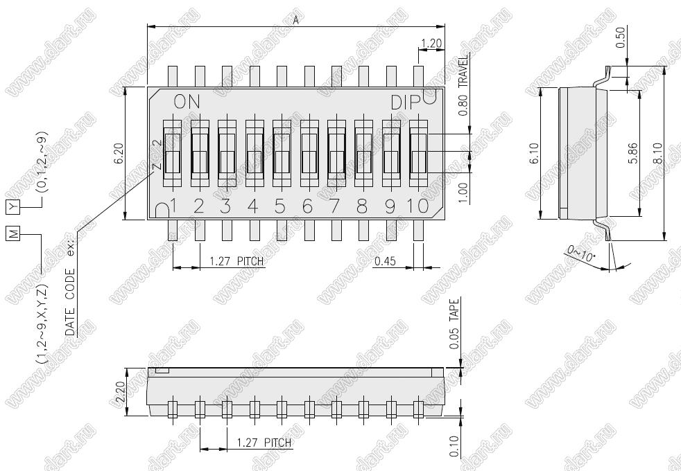 DHA-10TQR переключатель для поверхностного (SMD) монтажа; 10-позиц.; шаг 1,27мм 88263 DHA-10TQR 10 1800 шт звоните звоните