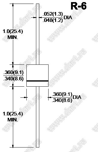 Максимальный средний выпрямленный ток I(AV): 6 А Максимальный пиковый прямой импульсный ток I FSM: 300 А Прямое падение напряжения VF@IF: 0,95 В (при токе 6 A) Максимальный обратный ток IR@VR: 10 мкА (при TA=25℃) Типовая емкость перехода Cj: 150 пФ Диапазон рабочих температур Tраб.: -55…+150 °C Корпус: R-6 |