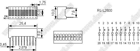 Каталог > Оптоэлектроника и индикация > Индикаторы светодиодные (сегментные дисплеи, матрицы, шкалы, светящиеся поля) > Шкалы cветодиодные > B10G (RL-L2500GAD/B4)