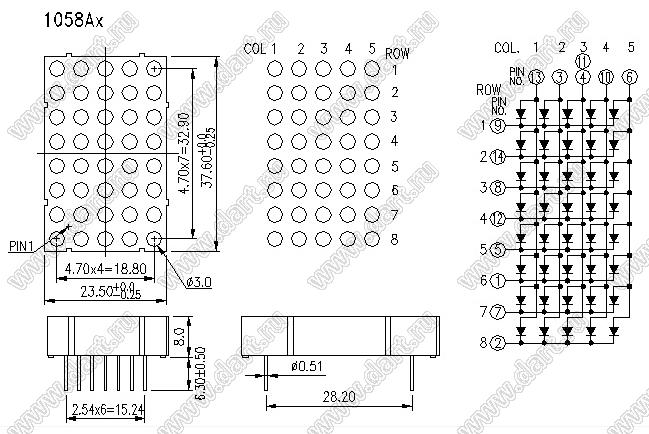 Каталог > Оптоэлектроника и индикация > Индикаторы светодиодные (сегментные дисплеи, матрицы, шкалы, светящиеся поля) > Точечные cветодиодные матрицы > 1,4" (5ч8) точечная серия > BJ1058AH