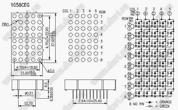 Каталог > Оптоэлектроника и индикация > Индикаторы светодиодные (сегментные дисплеи, матрицы, шкалы, светящиеся поля) > Точечные cветодиодные матрицы > 1,4" (5ч8) точечная серия > BJ1058CEG