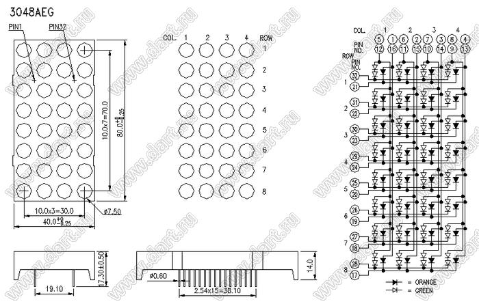 Каталог > Оптоэлектроника и индикация > Индикаторы светодиодные (сегментные дисплеи, матрицы, шкалы, светящиеся поля) > Точечные cветодиодные матрицы > 3,0" (4x8) точечная серия > BJ3048AEG