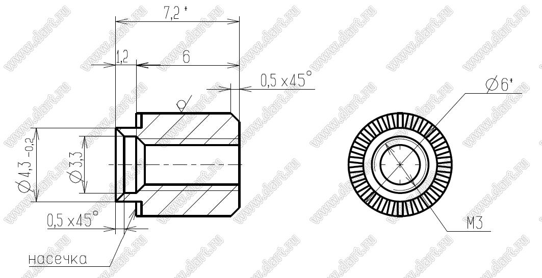 Каталог > Фурнитура для электронных устройств > Крепеж металлический (метизы) и пластиковый > Втулки резьбовые развальцовочные (бонки) > Втулки резьбовые развальцовочные (бонки) M3 > vtulka_m3x6_1