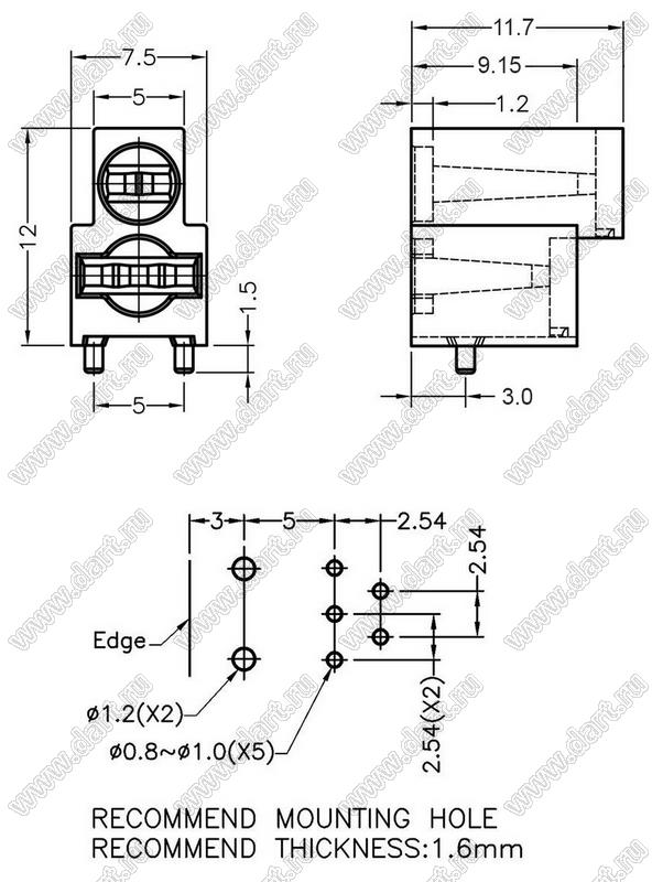 Каталог > Фурнитура для электронных устройств > Держатели и изоляторы компонентов > Держатели светодиодов > Держатели светодиодов угловые на плату > 2 x d=3,0мм > LEK-345