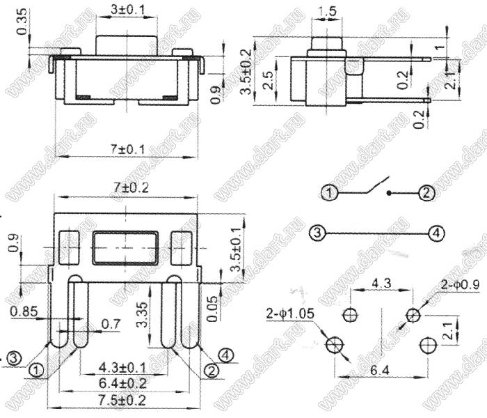 Каталог > Электронные компоненты, радиодетали > Переключатели, кнопки > Переключатели тактовые (TACT, тактовые кнопки) > Тактовые кнопки прямые для монтажа в отверстия платы > 3,5x6,0 мм > THBP04-3.85