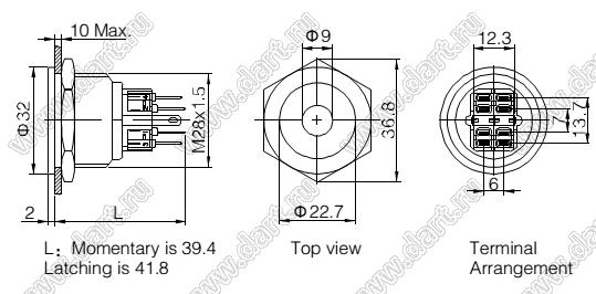 Каталог > Электронные компоненты, радиодетали > Переключатели, кнопки > Переключатели кнопочные (PUSH, кнопки) > Антивандальные кнопки > D=28мм Кнопка антивандальная с подсветкой > BLGQ28PF-22ZD/G/12V/S