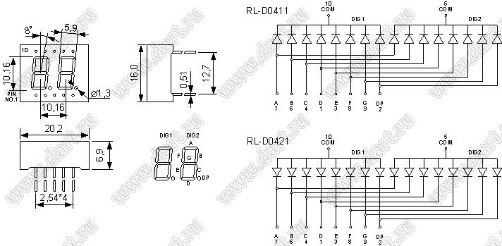 Каталог > Оптоэлектроника и индикация > Индикаторы светодиодные (сегментные дисплеи, матрицы, шкалы, светящиеся поля) > Цифровые и цифро-буквенные cветодиодные сегментные индикаторы (дисплеи) > 2-разрядные сегментные индикаторы > 2-разр. 0.36 дюйм. 7-сегм. 3261 серия > RL-D0421SBRW/D15