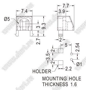 Каталог > Фурнитура для электронных устройств > Держатели и изоляторы компонентов > Держатели светодиодов > Держатели светодиодов угловые на плату > 1 x d=5,0мм > LEK-549