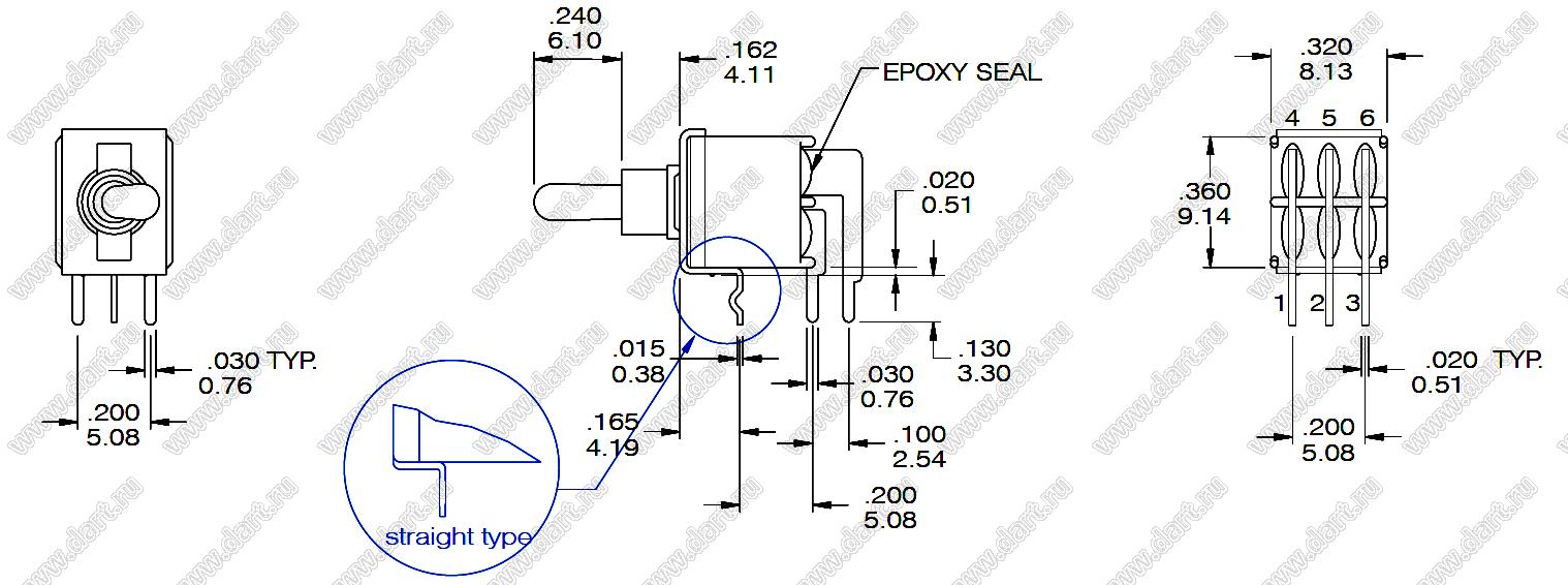 Каталог > Электронные компоненты, радиодетали > Переключатели, кнопки > Переключатели рычажные (тумблеры, TOGGLE) > E40 Переключатели рычажные герметичные > ES-7 серия микропереключателей > ES-7B-T3R-S-H (DPDT)