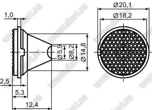 линза для светодиода, D=20мм, d=7,5мм, H=12,5мм, 15град; поликарбонат