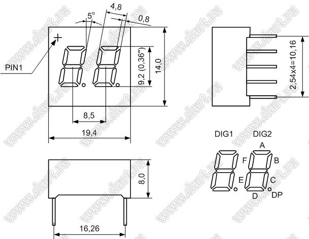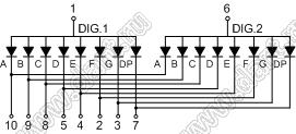 Каталог > Оптоэлектроника и индикация > Индикаторы светодиодные (сегментные дисплеи, матрицы, шкалы, светящиеся поля) > Цифровые и цифро-буквенные cветодиодные сегментные индикаторы (дисплеи) > 2-разрядные сегментные индикаторы > 2-разр. 0.36 дюйм. 7-сегм. 3262 серия > BJ3262FPG