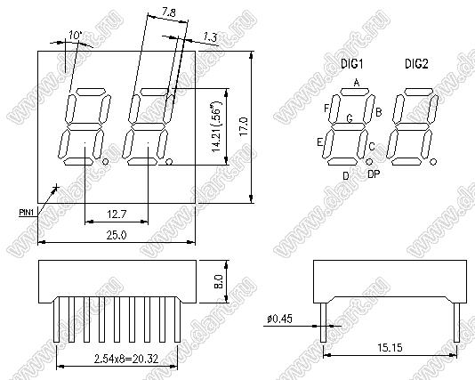 Каталог > Оптоэлектроника и индикация > Индикаторы светодиодные (сегментные дисплеи, матрицы, шкалы, светящиеся поля) > Цифровые и цифро-буквенные cветодиодные сегментные индикаторы (дисплеи) > 2-разрядные сегментные индикаторы > 2-разр. 0.56 дюйм. 7-сегм. 5265 серия > BJ5265APG