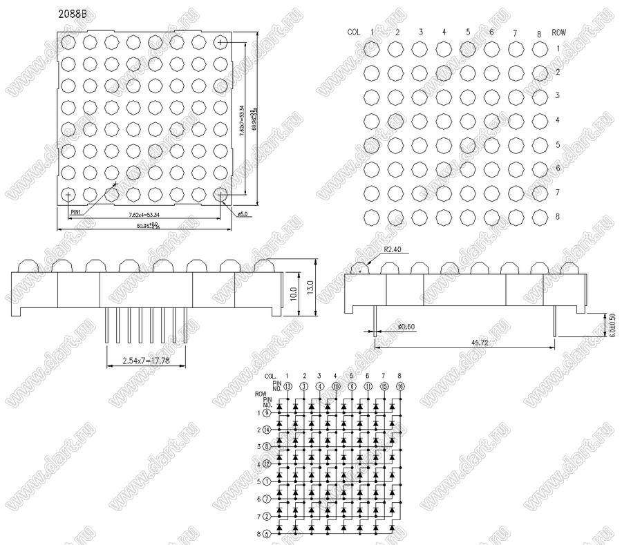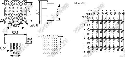 Каталог > Оптоэлектроника и индикация > Индикаторы светодиодные (сегментные дисплеи, матрицы, шкалы, светящиеся поля) > Точечные cветодиодные матрицы > 2,3" (8x8) точечная серия > BJ2088BH